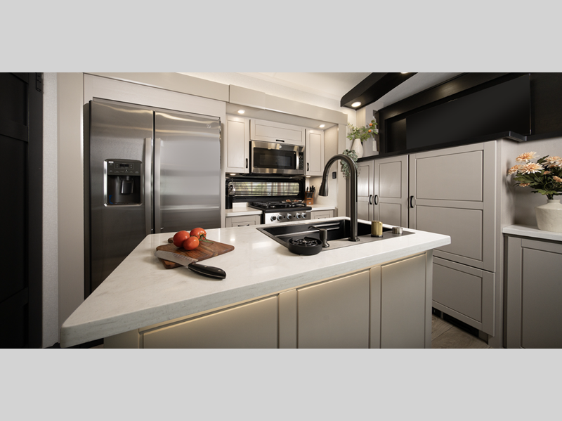 Sleeps 6 Slides 5 Length 43 ft 10 in Ext Width 8 ft 6 in Ext Height 13 ft 5 in Int Height 8 ft 6 in Interior Color Dune Gray Hitch Weight 3045 lbs GVWR 17995 lbs Dry Weight 15470 lbs Cargo Capacity 2525 lbs Fresh Water Capacity 75 gals Grey Water Capacity 82.5 gals Black Water Capacity 74 gals Tire Size 215/75R17.5"H Furnace BTU 40000 btu Available Beds King Refrigerator Type GE Residential Refrigerator Size 21 cu ft Cooktop Burners 4 Number of Awnings 2 LP Tank Capacity 40 lbs. Water Heater Type On Demand Tankless AC BTU 30000 btu TV Info LR 65" 4K Smart LED HDTV, Kitchen 40" TV, BR 32" 4K Smart TV Awning Info 12' and 19' Electric w/Integrated LED Lighting Axle Count 2 Washer/Dryer Available Yes Number of LP Tanks 3 Shower Type Walk-In Shower Similar Floorplans