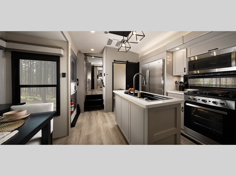 Sleeps 4 Slides 3 Length 42 ft 11 in Ext Width 8 ft 6 in Ext Height 13 ft 3 in Int Height 6 ft 7 in Interior Color Dune Gray Hitch Weight 2775 lbs GVWR 17650 lbs Dry Weight 14830 lbs Cargo Capacity 2820 lbs Fresh Water Capacity 75 gals Grey Water Capacity 87 gals Black Water Capacity 87 gals Tire Size 215/75R17.5H Furnace BTU 40000 btu Available Beds King Refrigerator Type GE Residential Refrigerator Size 21 cu ft Cooktop Burners 4 Number of Awnings 2 LP Tank Capacity 40 lbs. Water Heater Type On Demand Tankless AC BTU 30000 btu TV Info LR 4K Smart LED HDTV, BR 32" 4K Smart TV Awning Info 11' & 21' Electric w/Integrated LED Lighting Axle Count 2 Washer/Dryer Available Yes Number of LP Tanks 3 Shower Type Walk-In Shower Similar Floorplans