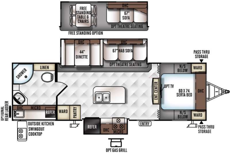 As you enter the travel trailer, to the left is a slide with a three burner range, countertop, and refrigerator. Next to the slide is a pantry and wardrobe. The kitchen island has plenty of counter space and a double kitchen sink. The opposite side of the travel trailer has a slide with a dinette or you can choose an optional free-standing table with chairs in place of the dinette, and a 67" hide-a-away sofa. You may even decide to choose theater seating in place of the sofa. In the front of the living area you will find an entertainment center.